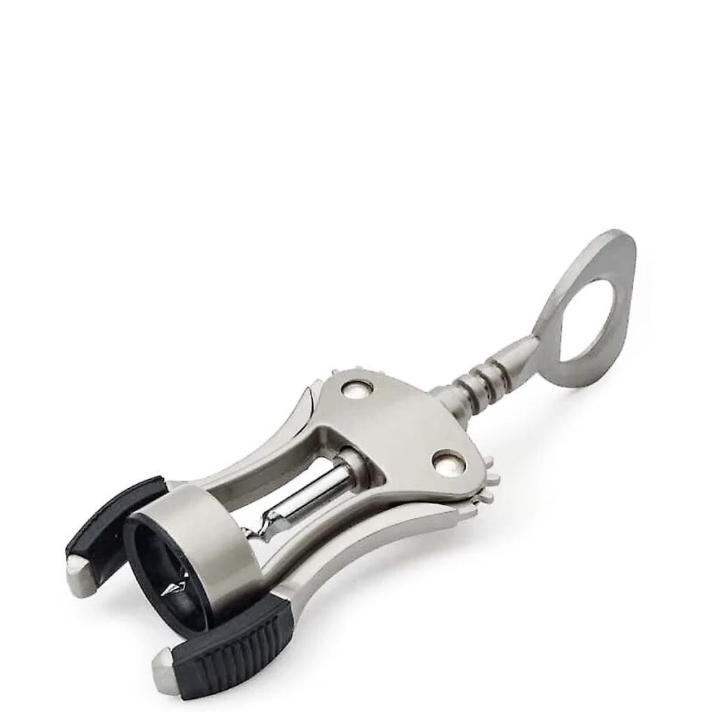 En mycket användarvänlig vinöppnare med ergonomisk hävarm. Efter att man skruvat i korkskruven drar man ner hävarmarna vliket tvingar upp korken ur flaskan. Handtagen är längst ut försedda med svart gummi för ökad greppbarhet och överst finns även en kapsylöppnare.