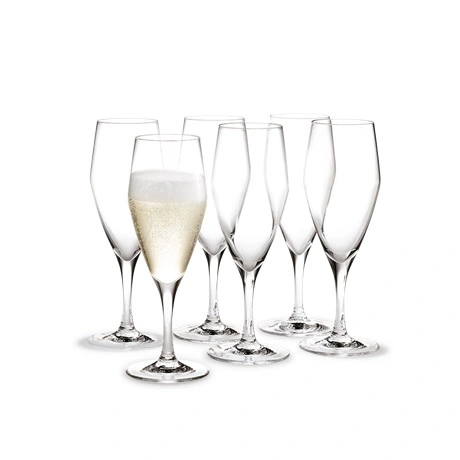Ett nätt, matchande champagneglas. Perfection Champagne har den för serien karraktäristiska formen på kupan, men kroppen är smal och lång för att bevara kolsyran i drycken. Ett mycket elegant litet glas för mousserande viner som Champagne, Crémant, Prosseco och Cava.