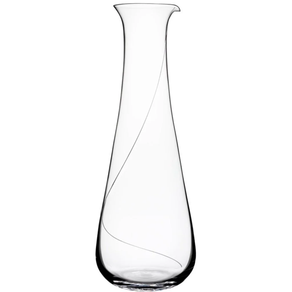 En vacker vinkaraff från Kosta Boda. Line Vinkaraff har en tunn glastråd som virar sig runt glaskroppen och skapar ett djup i designen. Den avlånga formen gör denna dekanterare lämplig till vita viner, eller viner som ej fordrar så mycket oxidation. Halsen är försedd med en pip upptill som underlättar vid servering.