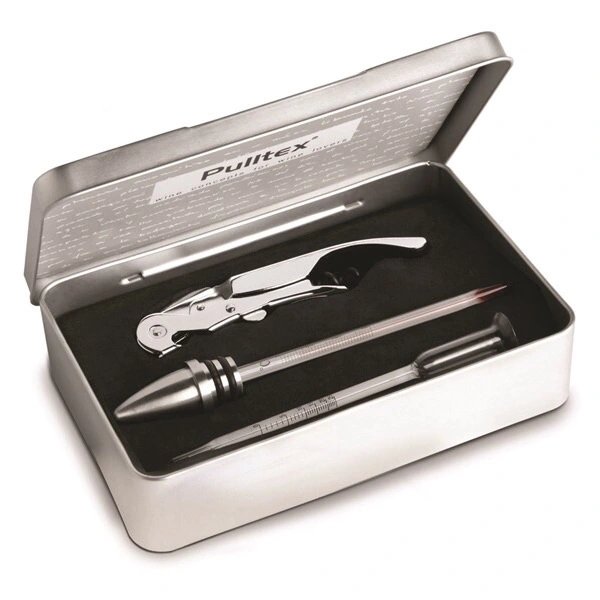 Ett elegant set med en vinöppnare, vintermometer och pipett från spanska Pulltex. Den högkvalitativa vinöppnaren Pullparrot Click Cut har här fått sällskap av en matchande vintermometer och en pipett för sensorisk analys. Click Cut Pullparrot har försetts med en smart funktion där man med en hand kan fälla ut kniven som skär loss foliet. Den teflonförsedda korken är dessutom extra lång, vilket underlättar vid öppning av flaskor med större korkar. Levereras i en stilig metallbox vilket gör den perfekt som present.