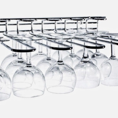 En elegant anordning för att förvara dina vinglas hängande. Detta väggmonterade glasrack har plats för upp till 15 st vinglas. Konstruktionen består av rostfritt stål och fungerar utöver som vinglasrack även utmärkt till att förvara vanliga glas ovanpå (dock ej samtidigt). Ett utmärkt rack som skapar en lyxig restaurangkänsla hemma.